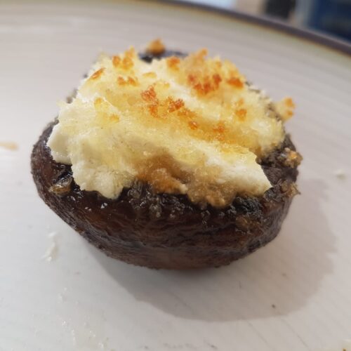 Remove the pan after another 3 minutes and carefully flip the mushrooms back over so the insides are facing up. Using two spoons or a piping bag, fill the mushroom caps with the goat cheese mixture. Sprinkle the stuffed caps with panko bread crumbs and return to the oven for another 2-3 minutes, until panko is golden brown.